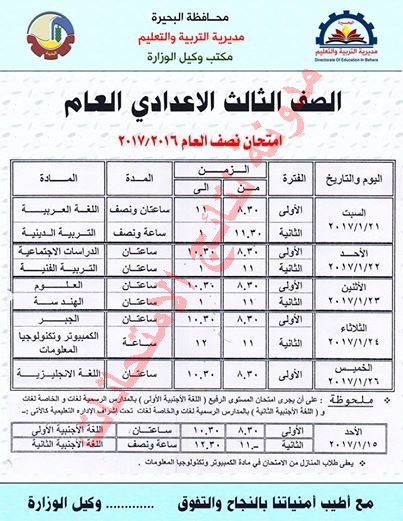 جدول امتحان الشهادة الاعدادية آخر العام 2018 جميع المحافظات جدول امتحانات الصف الثالث الاعدادي الترم الثاني 2018