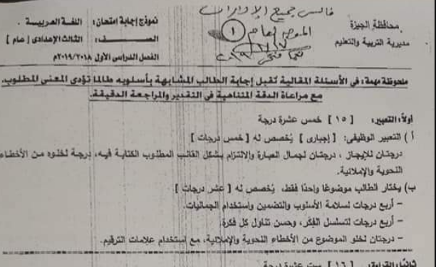 نموذج اجابة امتحان اللغة العربية للصف الثالث الاعدادي ترم اول 2019 محافظة الجيزه