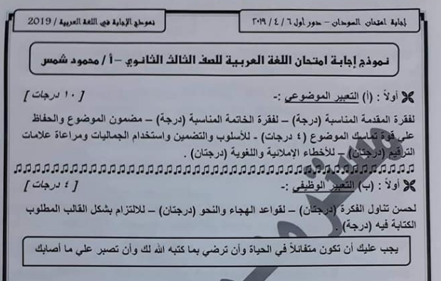 اجابة امتحان اللغة العربية 2019 للثانوية العامة نموذج الكنترول الرسمى بتوزيع الدرجات